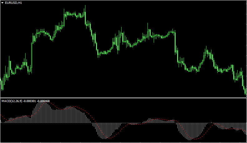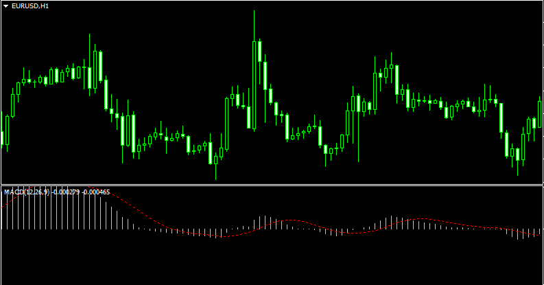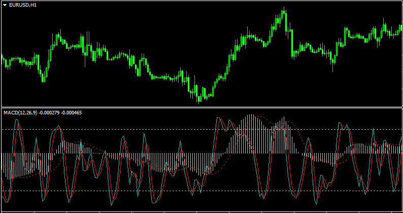 Индикатор MACD появляется на графике в отдельном окошке рабочей области. Справа имеется шкала значений, которые, впрочем, никакой особой роли в торговле не имеют, так как графическое представление индикатора очень наглядно, положительные и отрицательные значения легко определяются. Всего в индикаторе два основных элемента: