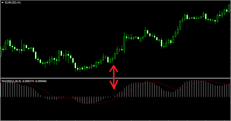 2. Следующие два сигнала как бы дополняют друг друга. Речь идёт о направлении изменения столбиков диаграммы и пересечении нулевой отметки. Начнём с первого. Итак, если происходит последовательное изменение в одном направлении диапазона столбиков, это говорит о наличии тренда. То есть, если после сильного падения наблюдается уменьшение отрицательного значения индикатора MACD, то это говорит о начале тренда, направленного вверх. Аналогично и с падением диаграммы после сильного роста. Безусловно, это может оказаться просто коррекцией, поэтому данный сигнал следует рассматривать исключительно как вспомогательный. Точка разворота определяется другими методами, а вот подтверждение смотрим уже на МАКД.