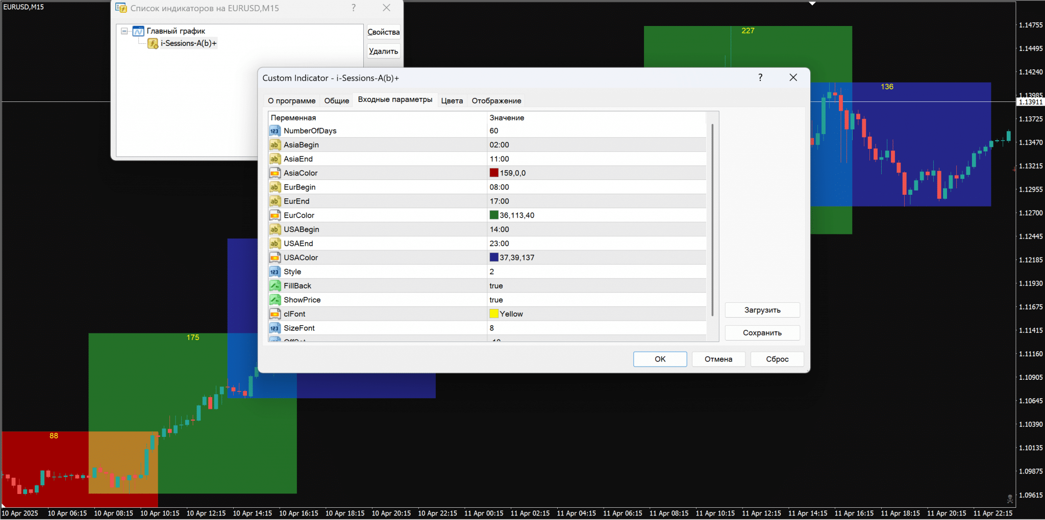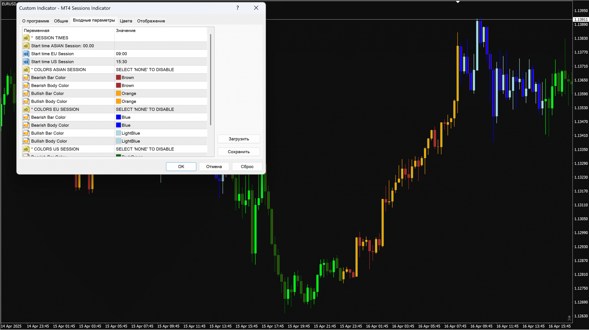 - Цветовую схему. Можно задать произвольные цвета каждой из торговых сессий.