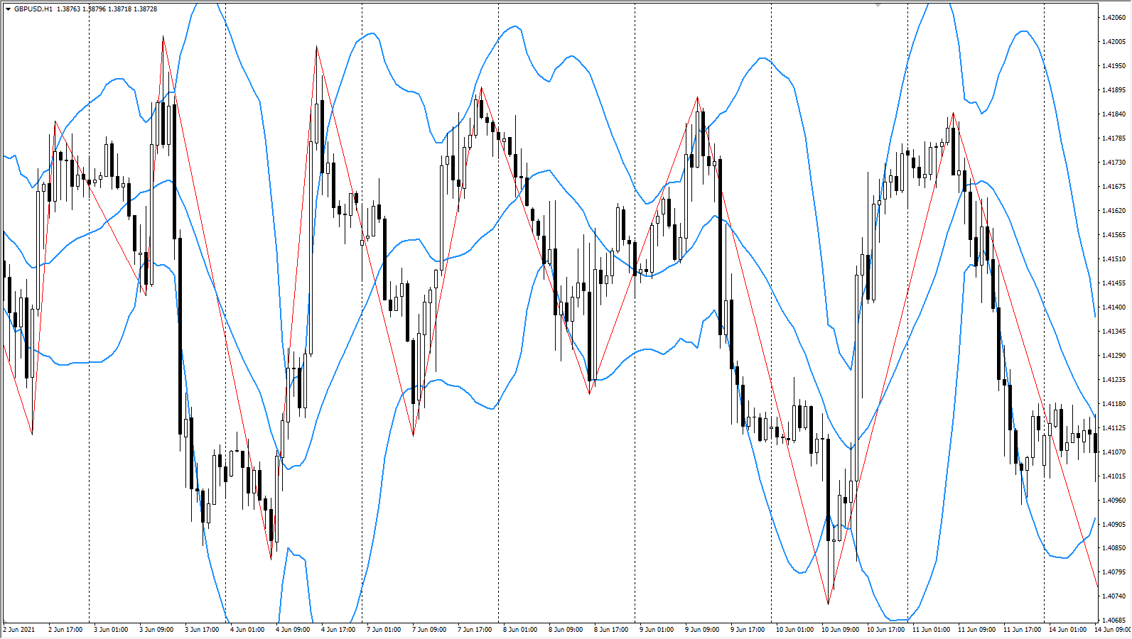 - Zigzagzug – гибрид обычного зигзага и канального индикатора. Выше разбирался пример комбинации стандартной версии индикатора с полосами Боллинджера, в Zigzagzug реализован именно этот принцип.