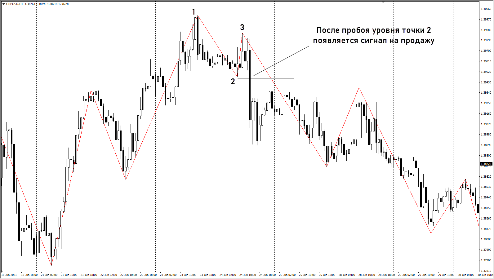 - Облегчение графического анализа. С помощью зигзага проще вычленять графические паттерны, правда, если они формируются на слабых движениях графика, то индикатор может пропустить их. Zigzag хорошо подходит, например, для поиска разворотных конструкций, этот паттерн называется 1-2-3 и характеризуется неспособностью рынка продолжить движение в прежнем направлении.
