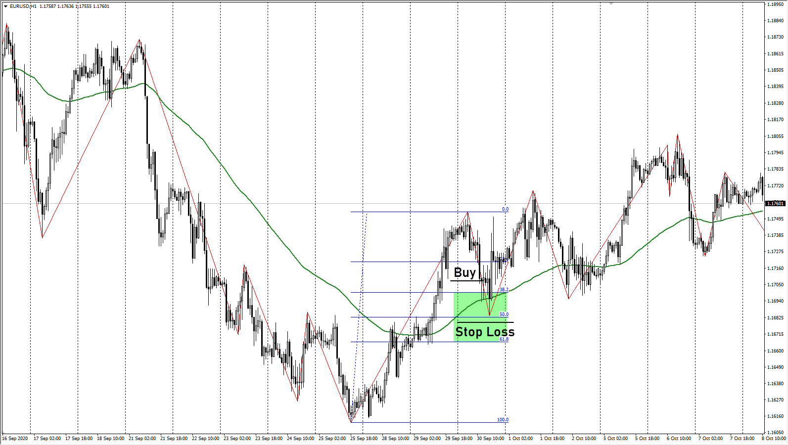 Затем начинается коррекция, при откате следующая волна индикатора не должна пересечь ЕМА в обратном направлении. В идеале откат завершается непосредственно на линии мувинга. Уровни Фибоначчи дополнительно фильтруют точку завершения коррекции – она должна находиться в диапазоне уровней 38,2%-61,8%. Также по Фибо уровням выставляется стоп-лосс, его желательно выносить за следующий уровень коррекции.