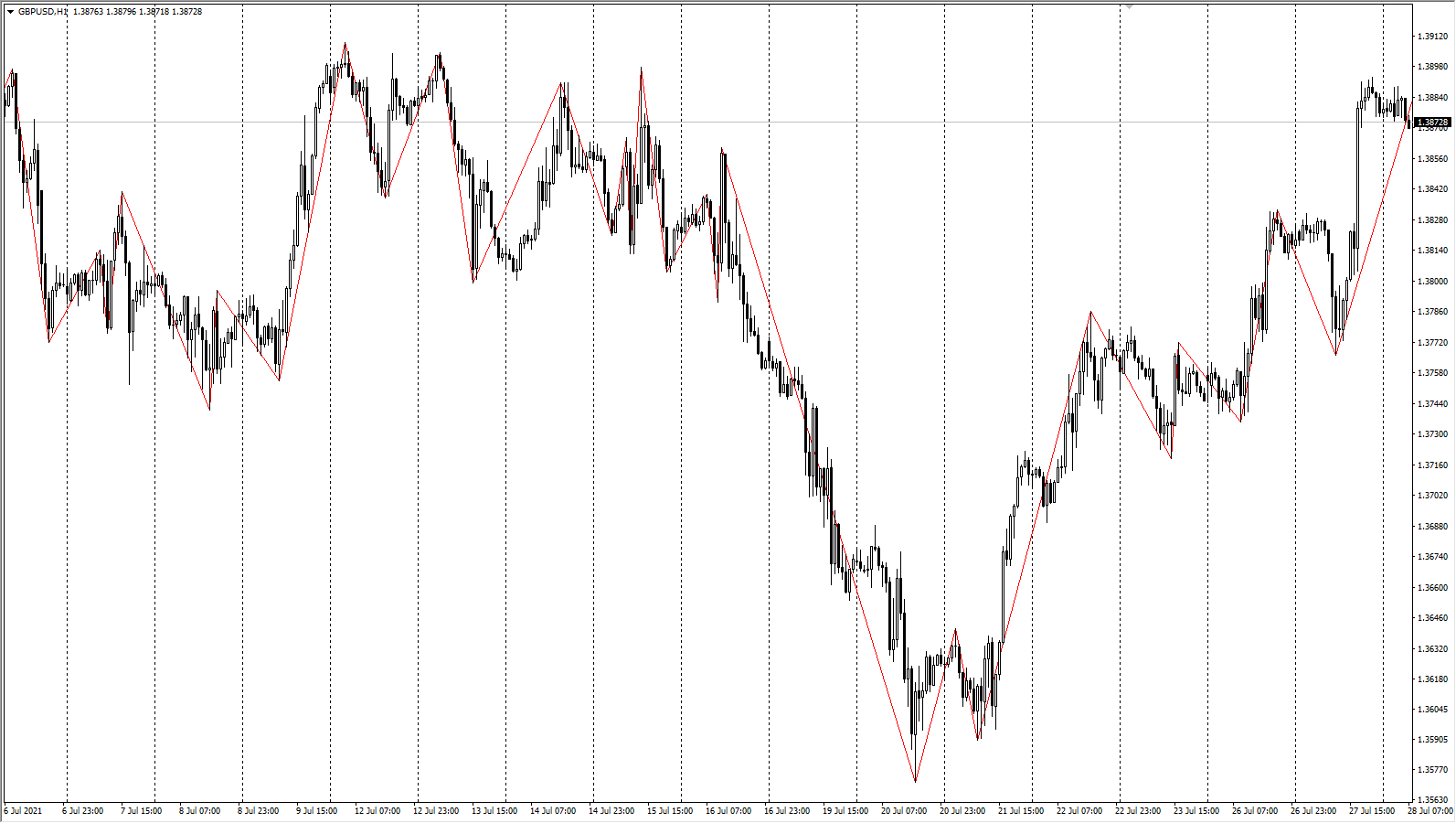 После добавления на график индикатор zigzag строит ломаную линию поверх свечей. Получаем зигзагообразную линию, по мере формирования новых свечей индикатор обновляет разметку, добавляя новые сегменты с правой части графика. Зигзаг фактически бесконечен, если попробовать переместиться в глубокую историю, то увидите, что построения ведутся с первой доступной свечи.