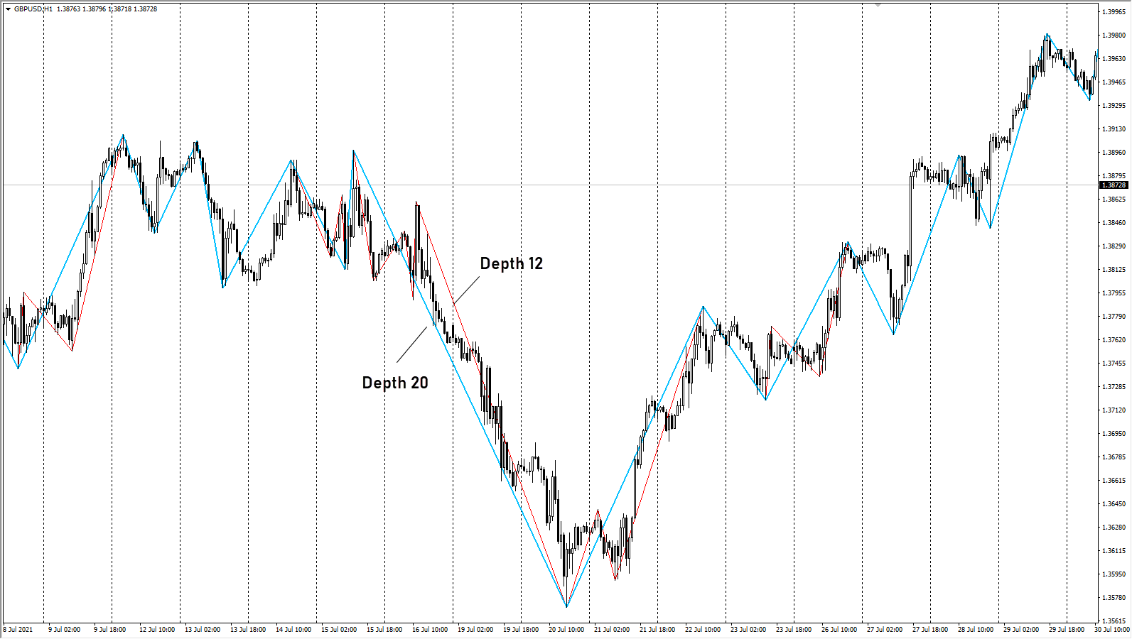 - Depth – расстояние между вершинами зигзага одного типа, то есть между соседними максимумами или минимумами. Задается в свечах, за счет этого параметра индикатор отфильтровывает ситуации с резким ростом волатильности, когда за 1-2 свечи график растет/падает на десятки пунктов.