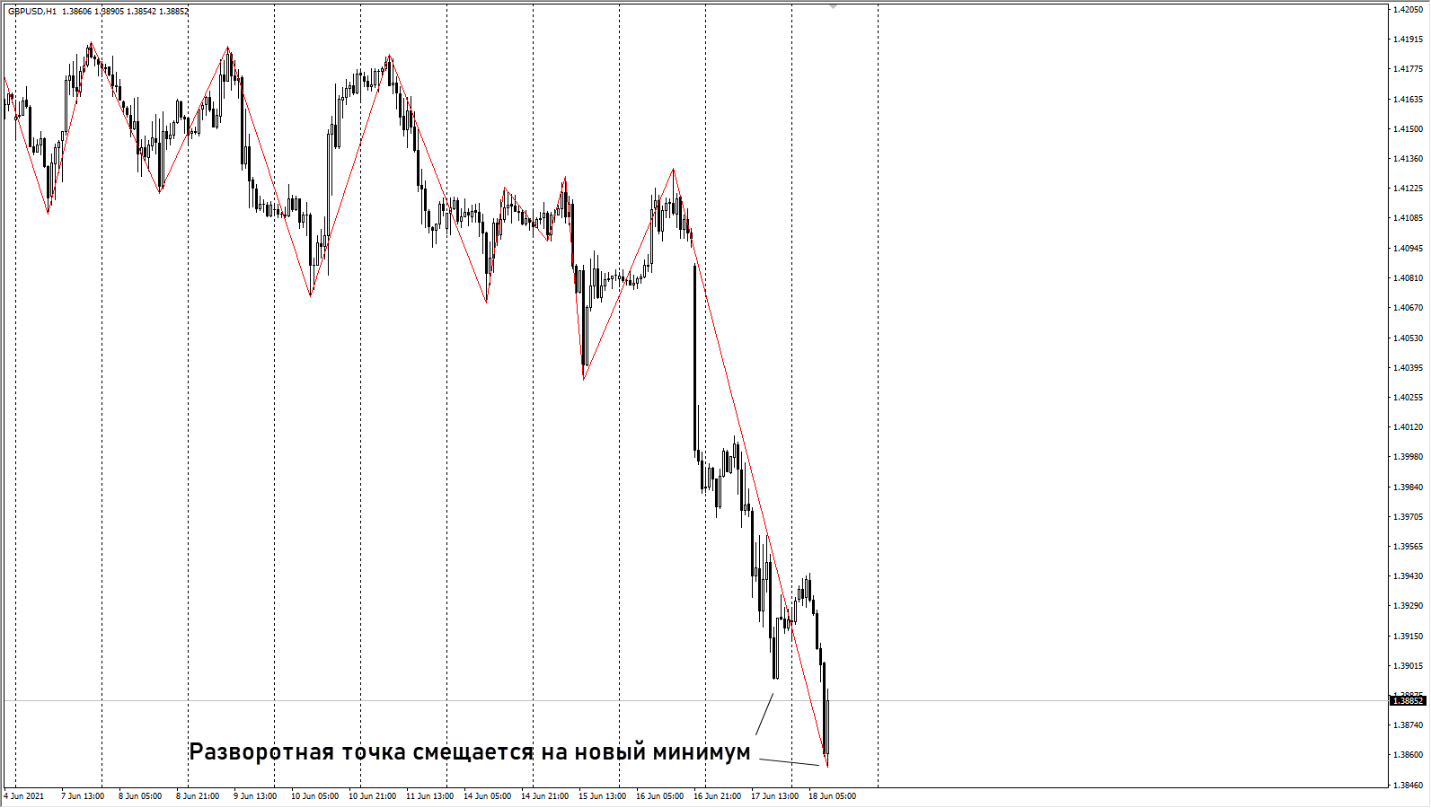 Но рост оказался умеренным. Возобновляется снижение, и предполагаемая точка разворота смещается на новый минимум. На трендовом движении с неглубокими коррекциями это может повторяться неоднократно, давая целые серии ложных сигналов.
