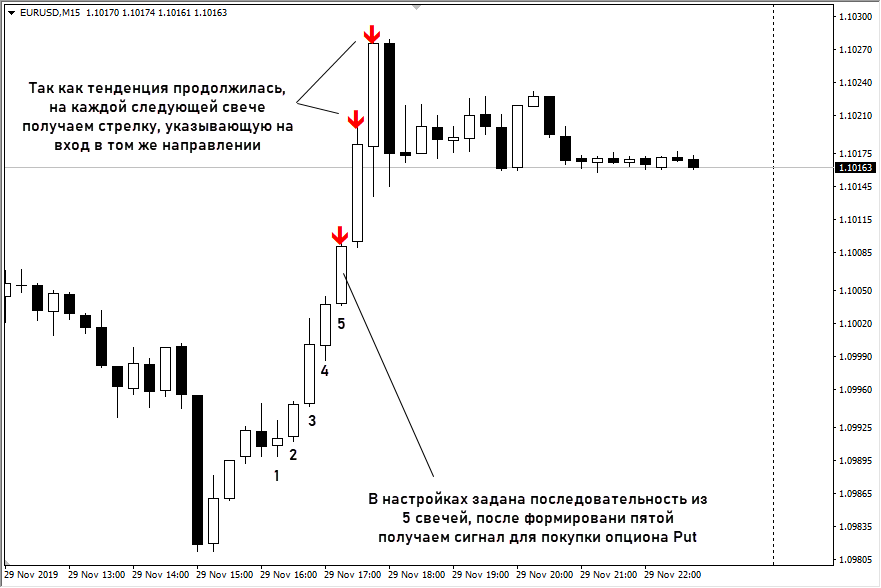 В настройках задается количество последовательных баров, например, 5. Как только появится 5 свечей одного цвета подряд индикатор тут же нарисует стрелку, указывающую на вход в рынок в противоположном направлении. Если тенденция продолжится, то стрелки будут формироваться на каждой следующей свече.