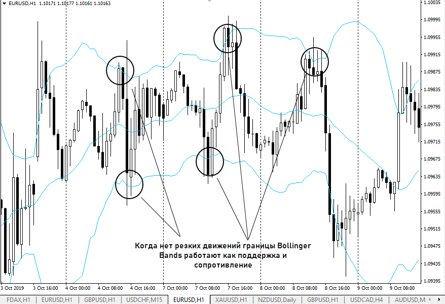 - полосы Боллинджера (Bollinger Bands) – хорош тем, что автоматически строит канал с шириной, изменяющейся в зависимости от волатильности. Подходит и для флетовых участков рынка, и для трендов. Стандартные сигналы – отбой от границы, есть и более агрессивный стиль работы – после выхода за пределы ВВ торговля ведется в расчете на разворот;