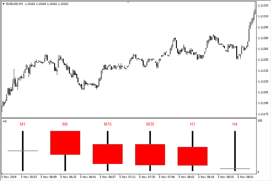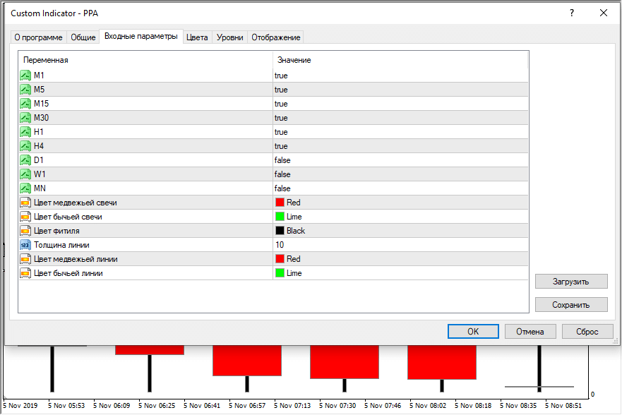 После добавления на график PPA в подвале отображает свечи по всем указанным в настройках таймфреймам. При работе на минутном графике можно ограничиться свечами до Н1-Н4 включительно. Смотреть на недельные и месячные графики лишено смысла.