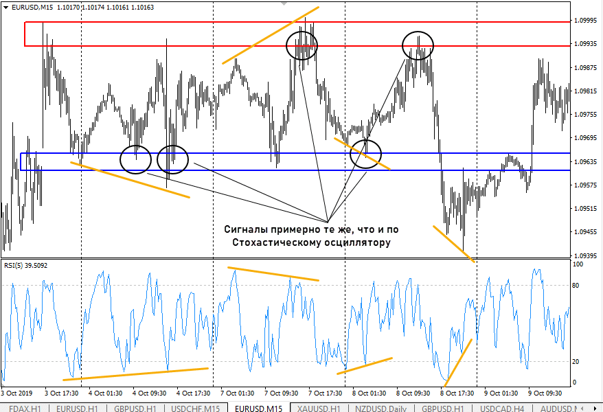 - RSI – принцип работы схож со Стохастиком, подробнее о нем читайте здесь. Есть стратегии, в которых совместно используются и Стохастический осциллятор, и индекс относительной силы. Принцип использования тот же – чаще всего трейдеры ищут дивергенции и конвергенции, торгуют выход линии RSI из зоны перепроданности или перекупленности;