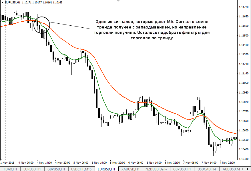 Большинство индикаторов дают сигналы постфактум. То есть событие на графике уже произошло и с небольшой задержкой об этом сообщает индикатор. Например, сменился тренд, и только через 5-7 свечей получаем сигнал в виде пересечения мувингов.