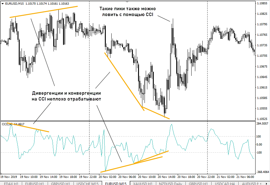 - CCI – индекс товарного канала отличается от Стохастика и RSI тем, что у него нет шкалы, то есть отсутствуют граничные значения, которые может принимать индикатор. Подробнее о принципе работы и настройках можете прочесть в обзоре CCI. В случае с бинарными опционами торгуют чаще всего дивергенции и «крюки» из зон экстремальных значений. Последний тип сигналов формируется после импульсных движений и подходит для БО с малыми сроками экспирации (1-2 свечи).