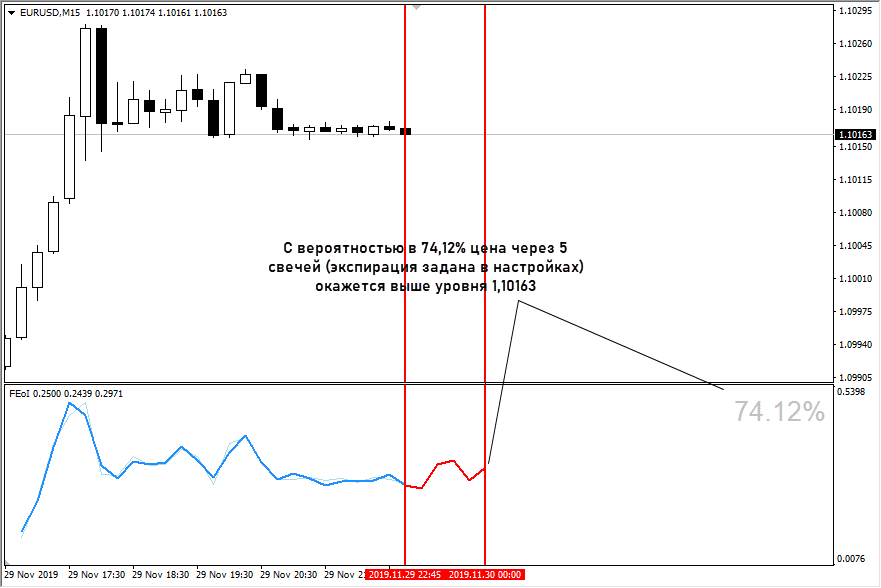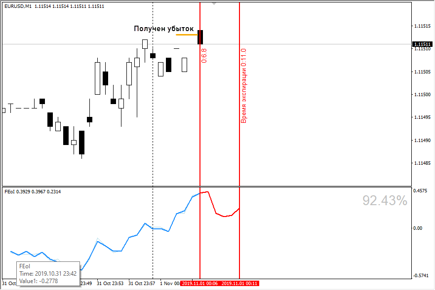 Индикатор создавался именно под бинарные опционы. Данные отображаются в «подвале», линия показывает ожидаемое движение графика в будущем и вероятность отработки сигнала в процентах. Также для работы нужно задать экспирацию сделки. Желательно не выбирать экспирацию в 1-2 свечи, но и чересчур большой (20+ свечей) задавать ее не нужно.