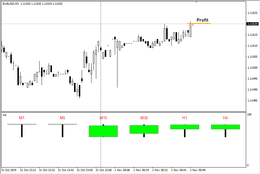 Так как в бинарном трейдинге нас не интересует масштаб готовящегося движения, глубокий анализ рынка на всех таймфреймах не выполняется. Для торговли достаточно, чтобы на рабочем и старших таймфреймах свечи были одного цвета. Как только это условие выполняется, можно входить в рынок с экспирацией в 5-7 свечей.