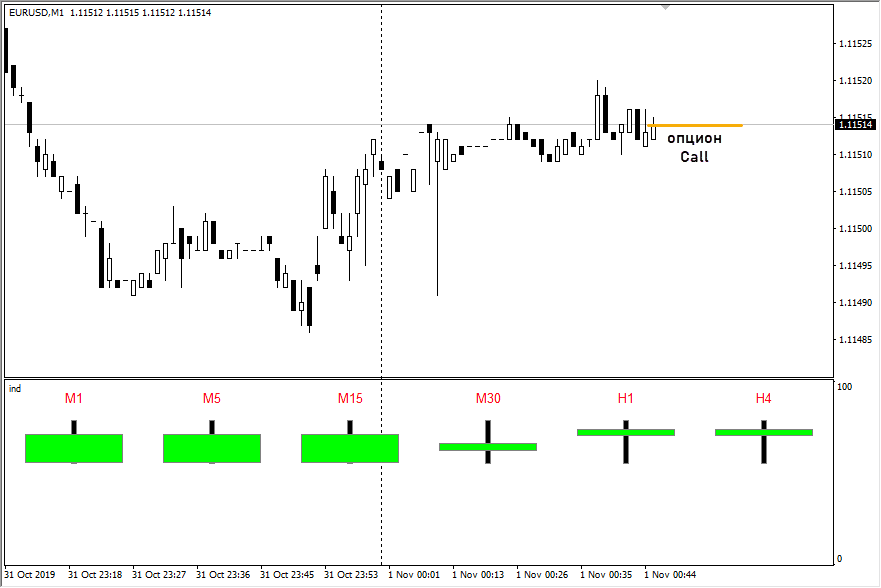 - ждем формирования свечей одного цвета на временных интервалах М1-Н4. Все свечи бычьи – покупается опцион Call;