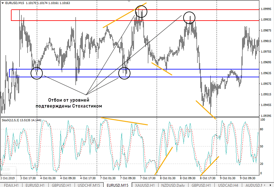 - Stochastic – стохастический осциллятор обычно используют при работе в горизонтальном канале. Идеальный вариант – работа на низкой волатильности, пересечение линий индикатора и их выход из зоны дает точку входа. Еще один распространенный вариант использования инструмента – поиск дивергенций. С остальными методами торговли по Стохастику знакомьтесь по этой ссылке;