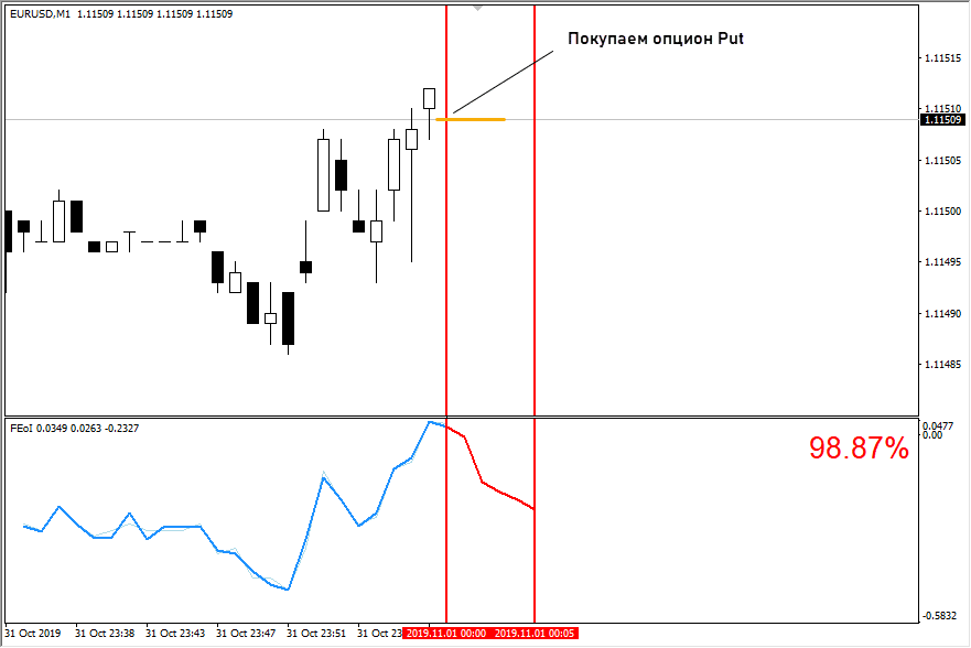 Покупать опцион нужно сразу после получения сигнала. В бинарном трейдинге даже пара пунктов может решить исход сделки. Если не успели и график уже прошел несколько пунктов в нужном направлении, не гонитесь за уходящим поездом, а ждите следующую точку входа.