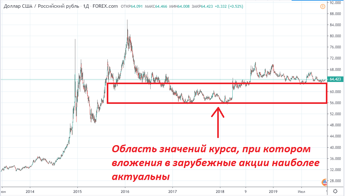 Теперь посмотрим как можно снизить влияние инфляции на инвестиции. Вернее, какие инвестиции наиболее устойчивы. На данный момент в России складывается удивительная ситуация, которая на руку всем среднесрочным и долгосрочным инвесторам. Суть заключается в том, что у нас есть теоретический порог курса рубля, за который ему не дают укрепиться – это район 60 рублей за доллар. Если бы мы имели прозрачное рыночное ценообразование, то рубль уже давно бы укрепился. Но Минфин выходит на биржу с покупками долларов, продавая рубли.