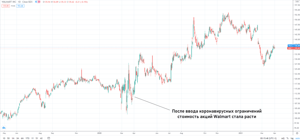 - Сферы, связанные с повседневной жизнью общества. Это своего рода защитные активы, несмотря ни на что люди не прекратят, например, делать покупки. Акции таких компаний отличаются стабильностью, например, бумаги Walmart стали расти после введения коронавирусных ограничений.