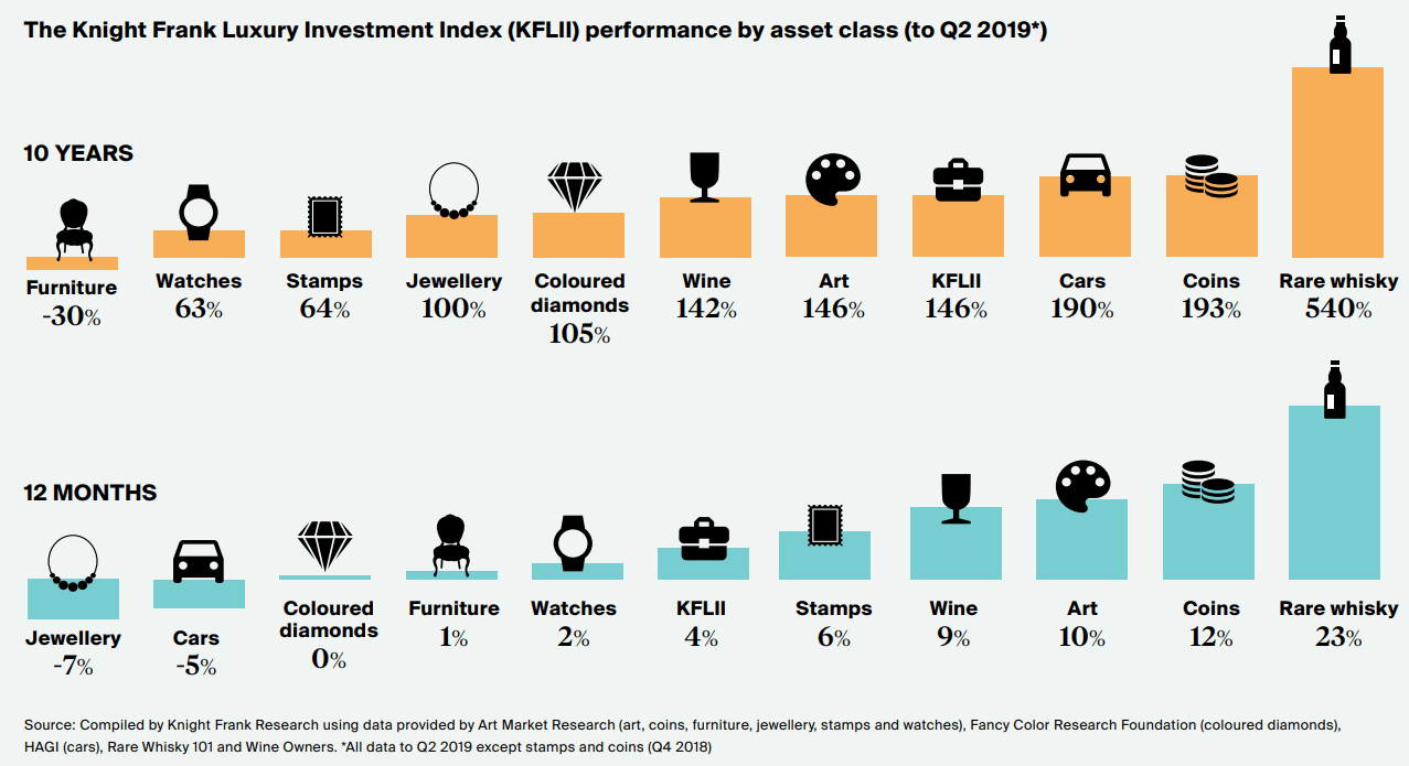 Интересным выглядит рост отдельных активов на дистанции инвестиций в 10 лет. Так называемый индекс роскоши Knight Frank Luxury Investment Index отображает изменение стоимости разных активов на дистанции. За промежуток с 2009 г. по 2019 г.: