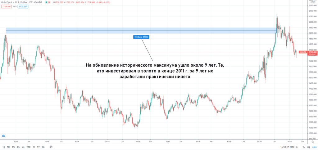 - Инвестиции на 10 лет в золото. Сам по себе актив неплох и подходит на роль защитного, но при вложениях на 10 лет высок риск попасть на фазу коррекции. На истории в 200+ лет желтый металл растет в цене, но периоды коррекции могут длиться по 10-30 лет. Если не повезет, то будет зафиксирован убыток.