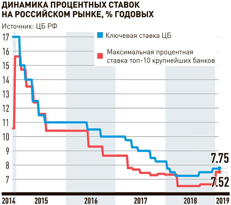 - Вложения в рублевый или валютный банковский депозит. Метод удобен с точки зрения простоты, но дает скорее не доход, а защиту капитала от инфляции. Возникают дополнительные неудобства, связанные, например, со штрафными санкциями за досрочное закрытие вклада. Банковский депозит — это защитный тип инвестирования, цель заключается в компенсации инфляции, реальная доходность в 0,5-1,5% – скорее приятный бонус. Еще одно неудобство – возможное снижение ставки для большого капитала. Например, 5% на суммы до 5 млн руб. и 1-3% на капитал сверх этой суммы. Ставки по депозитам всегда коррелируют со ставкой ЦБ РФ, а российский регулятор не собирается сильно повышать ее в ближайшие годы. Это касается и большинства иностранных центробанков.