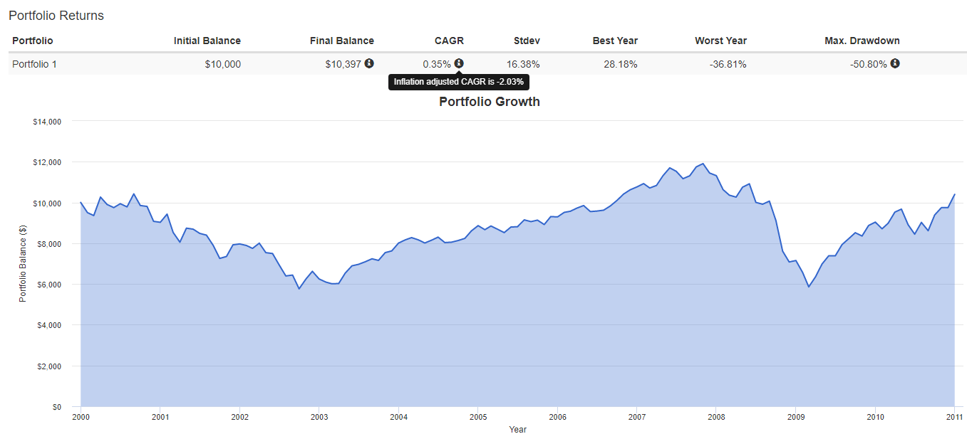 - Промежуток с 2000 г. по 2010 г. выдался крайне негативным для инвесторов в основной американский индекс. Вскоре после того как рынок восстановился после краха доткомов начался мировой финансовый кризис. По итогам десятилетия зафиксирован среднегодовой убыток в 2,03%.