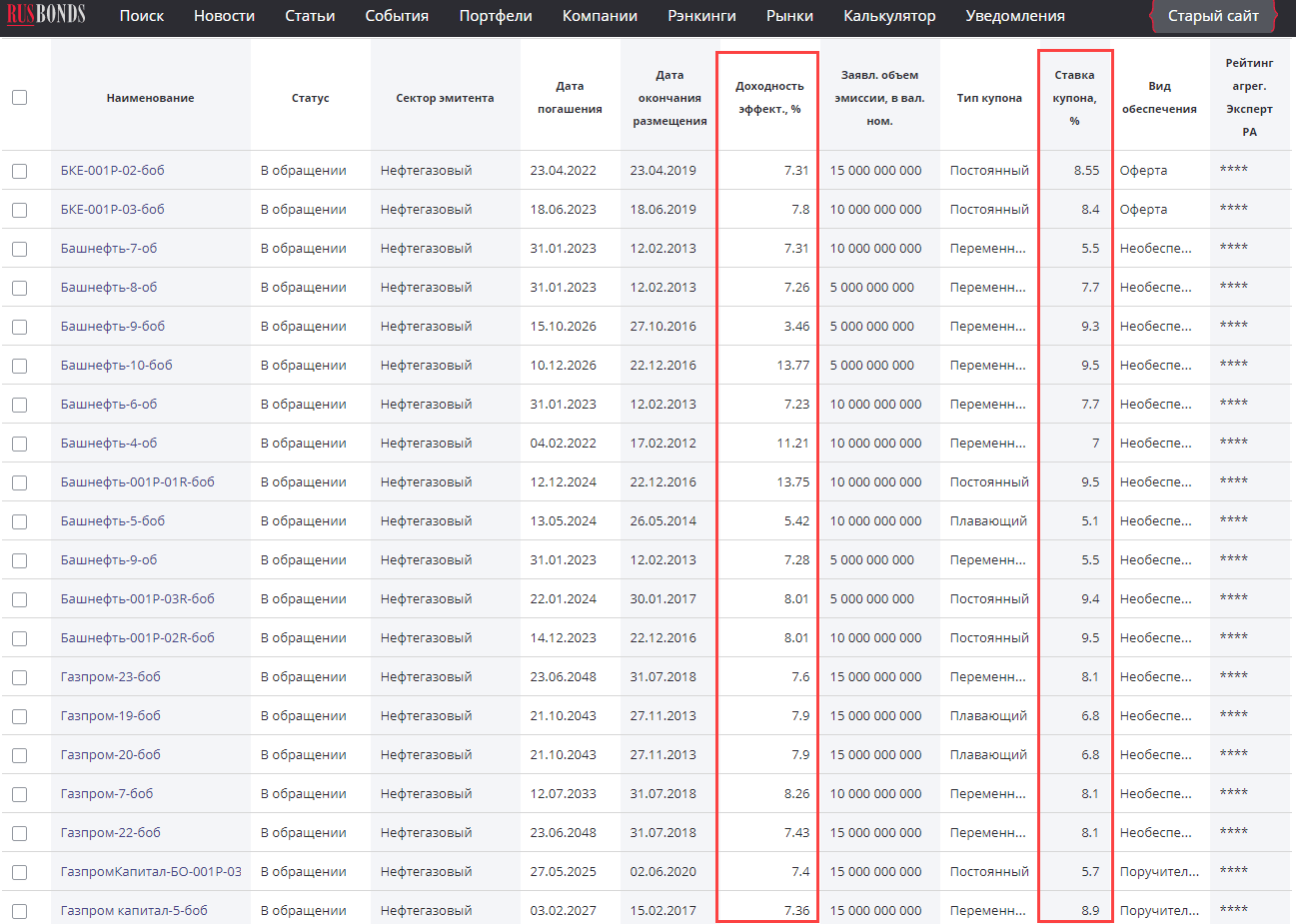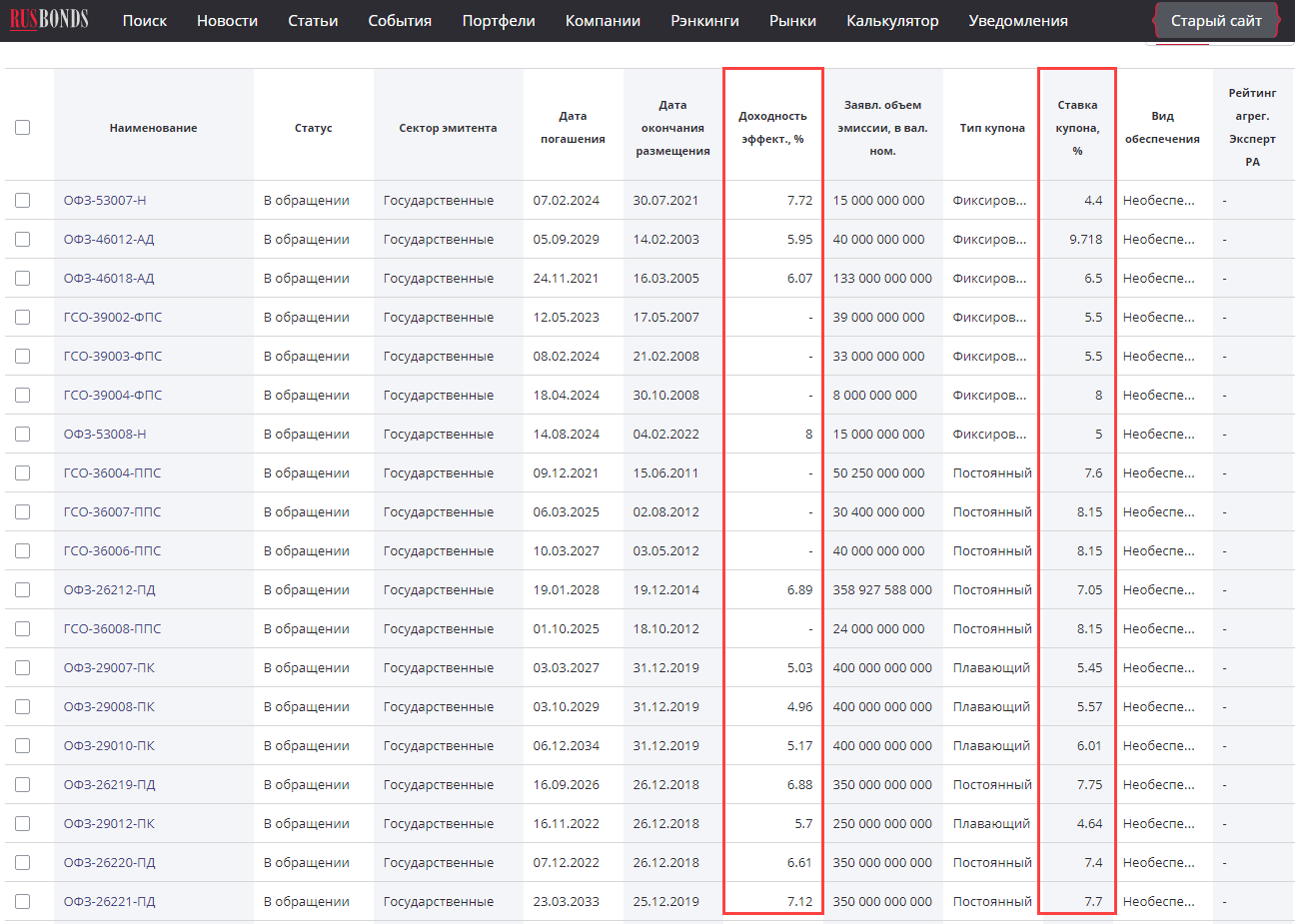 Полный список государственных и корпоративных облигаций доступен на rusbonds. На сайте есть удобный набор фильтров, там же доступны данные по доходности. Годовой купон зависит от ставки ЦБ, облигации разных выпусков имеют разную доходность.