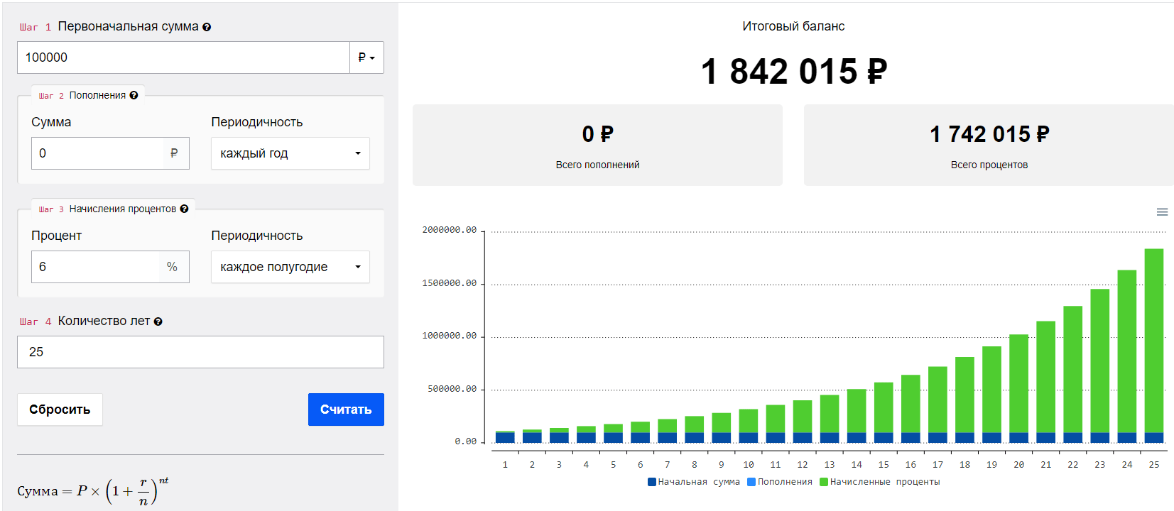 В остальном все стандартно. На многолетней дистанции начинает работать магия сложных процентов. Так, при стартовом капитале в 100000 рублей, ставке 6% годовых и капитализации процентов дважды в год за 25 лет стартовый капитал превращается в 1,842015 млн рублей. Для такой дистанции и стартовых условий это довольно слабый рост.