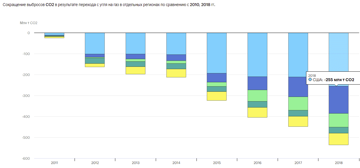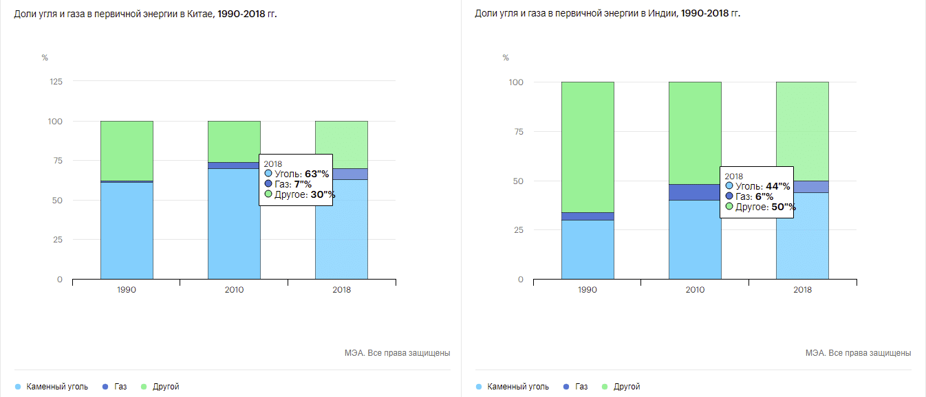 При этом говорить о доминировании газа в энергобалансе основных источников выбросов СО2 не приходится. Например, в Китае доля газа в 1990 г. составляла 1%, а к 2018 г. она выросла лишь до 7%. В Индии схожая тенденция – в 1990 г. доля газа составляла 4%, в 2018 г. – 6%.