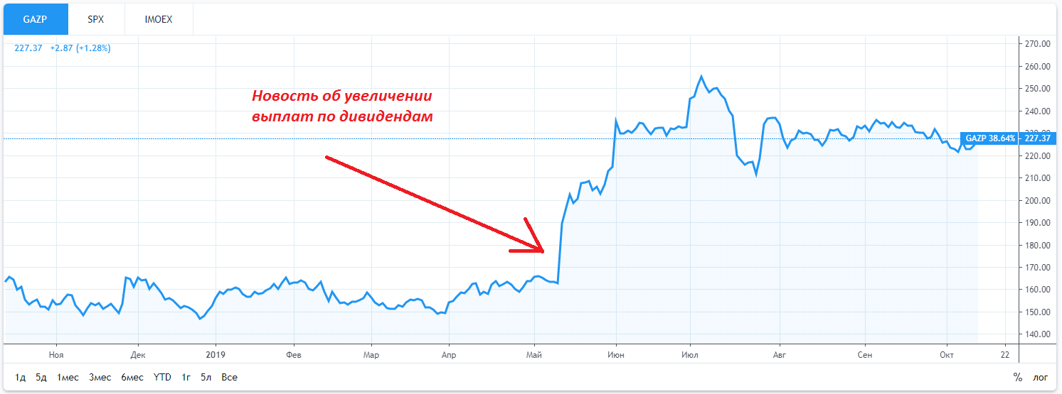 - Покупка акций с целью дальнейшей продажи по более выгодной цене. Тут доход может быть действительно большим. Одно только упоминание возможности увеличения дивидендных выплат может моментально спровоцировать массовые покупки. И исходя из нашего ориентира в 5-6% сама бумага легко может подорожать сразу на 10-20%, а иногда и больше. Здесь очень простая логика. Например, компания объявляет, что в этом году будет направлено не 30% прибыли на дивиденды, а 50%. Это рост выплат в более, чем полтора раза. Инвесторы тут же выкупят акции такой компании и цена снова придёт к тому равновесному состоянию, при котором дивиденды вернуться в область привычных значений. Здесь заработок на росте будет уже 50%, а не те скромные 5-6%, на которые можно рассчитывать при первом варианте.