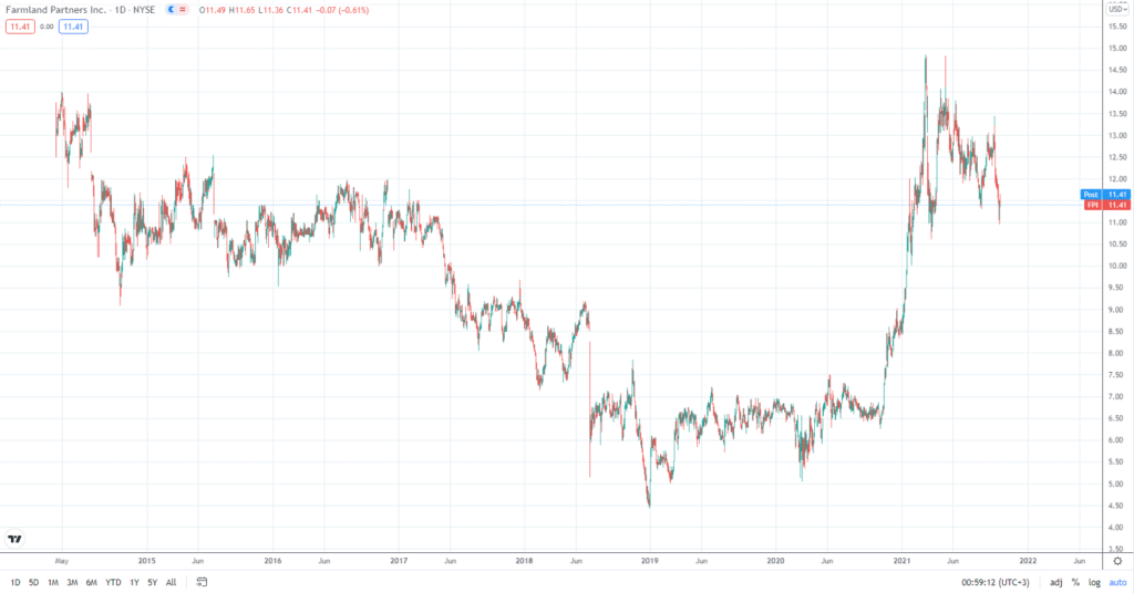 - FPI – Farmland Partners. Молодой REIT, его акции стали доступны на биржах лишь в 2014 г., как и предыдущий фонд сделан акцент на американском рынке. Затяжного бычьего тренда нет, до конца 2020 г. продолжалось плавное снижение стоимости акций, затем был рост на пару сотен процентов и обновление исторических максимумов.