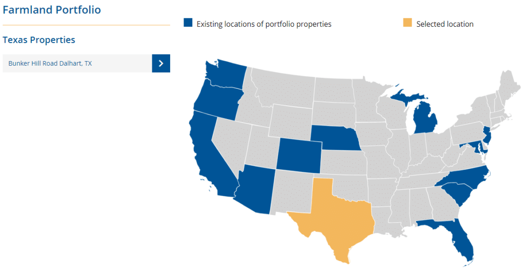 - Gladstone Land Corporation. Специализируется на американских фермерских угодьях, в его портфеле более 100 таких объектов. Работает с 1997 г., совокупная площадь с/х угодий превышает 90000 акров плодородных земель. Распределение инвестиций по штатам достаточно неравномерно.
