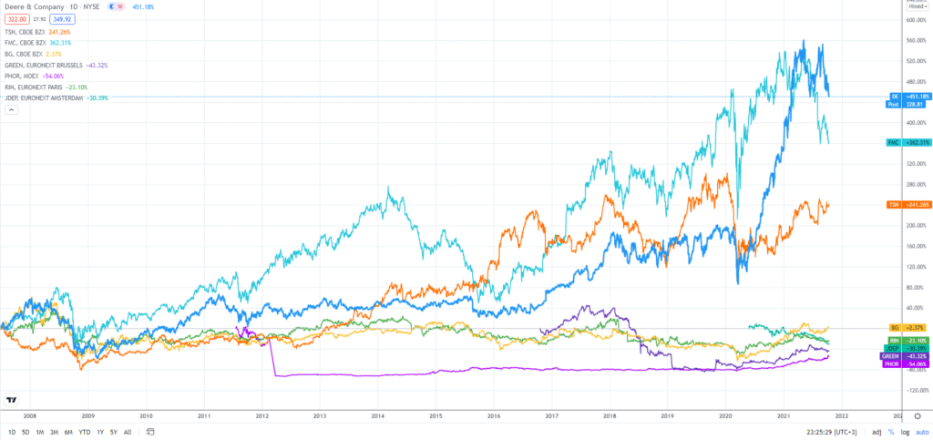 Если изучить поведение котировок перечисленных акций на истории, то видно, что не все из них растут. На одной и той же дистанции бумаги FMC Corporation подорожали на 362,31%, акции Bunge Limited выросли всего на 2,37%, а бумаги Greenyard подешевели на 43,32%.