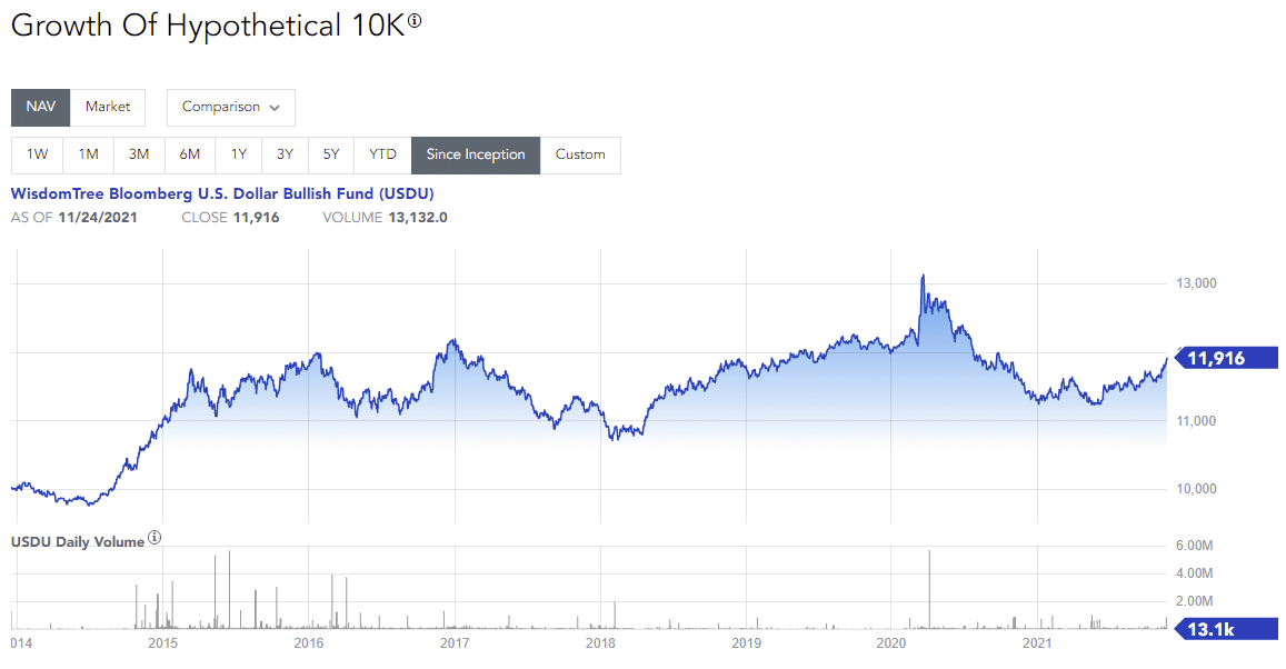Валютные ETF не приносят такой же доход как обычные биржевые фонды, копирующие соответствующие индексы. Например, если бы инвестор вложил $1000 в WisdomTree Bloomberg U.S. Dollar Bullish Fund в момент его основания, то к концу 2021 г. портфель вырос бы лишь на 19,16%. То есть годовой рост составил порядка 3% без учета инфляции.
