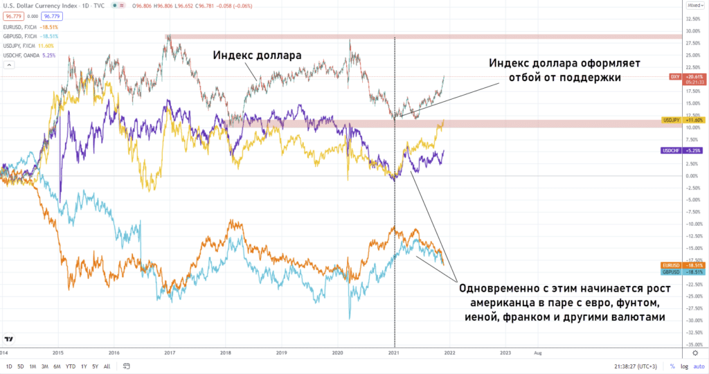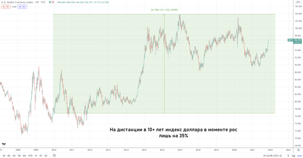 На валютном рынке нет многолетних бычьих трендов. Если взглянуть на тот же индекс доллара, то видно, что кратного роста нет. Если акции Apple в десятых годах подорожали на сотни процентов, то индекс доллара в это же время колебался в сравнительно узком диапазоне. На дистанции в 10 лет он рос лишь на 35%.