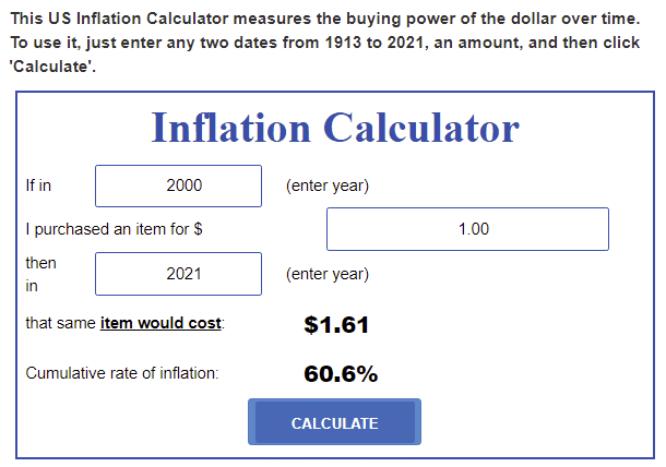 Например, на дистанции с начала 2000 г. по конец ноября 2021 г. доллар обесценился на 60,6%. Это означает, что в 2021 г. на $1000 можно купить на 60,6% меньше товаров и услуг по сравнению с началом 2000 г.