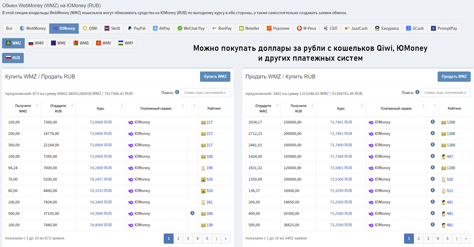 - Покупка через ЭПС. Многие ЭПС позволяют открывать счета в нескольких валютах, можно менять деньги в рамках электронной платежной системы без выхода на сторонние ресурсы. Например, у WebMoney есть отдельная торговая площадка, где пользователи торгуют друг с другом, правда, спред не рекордно низкий.
