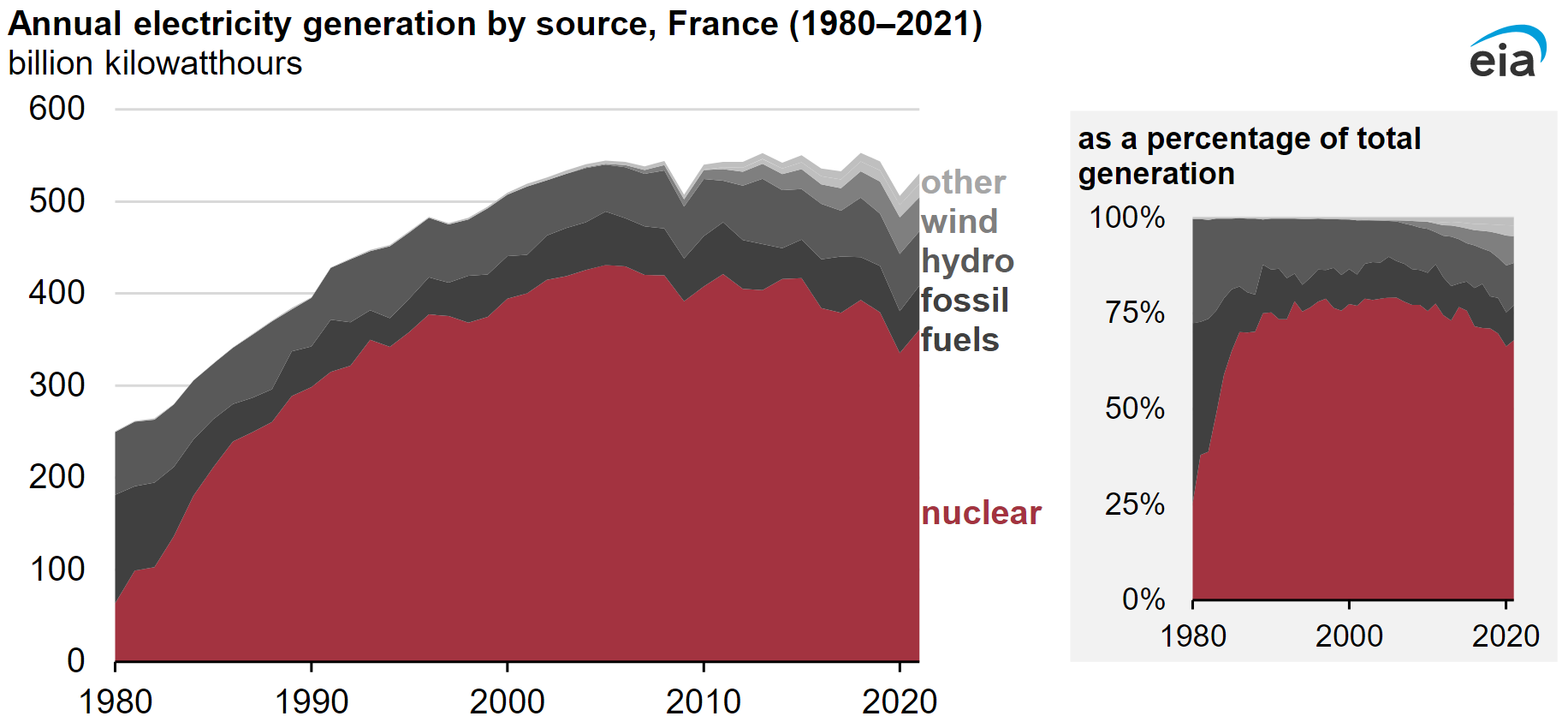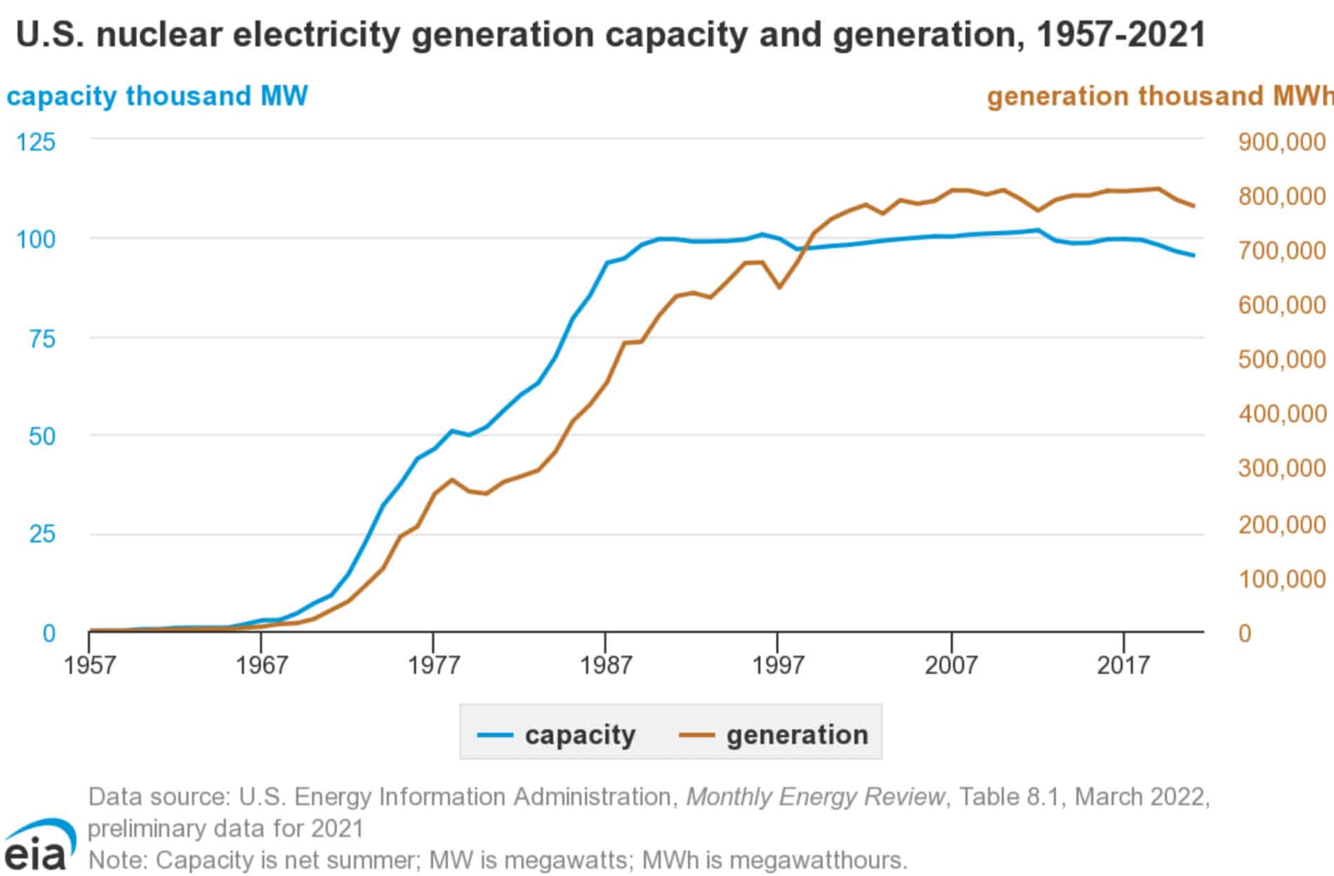 - В США по состоянию на ноябрь 2021 г. в стране действовало 93 реактора. Все они довольно старые, построены в промежуток с 1967 г. по 1990 г. Только в 2013 г. началось строительство 2 новых реакторов. Несмотря на временное снижение доли АЭС к концу текущего десятилетия ее долю планируют довести до 20+% от общей генерации электроэнергии. Периодически возникают дискуссии на тему закрытия отдельных АЭС, но пока что их удавалось отстоять. С начала нулевых генерация находится на плато, по мере вывода реакторов из работы могут наблюдаться незначительные просадки.