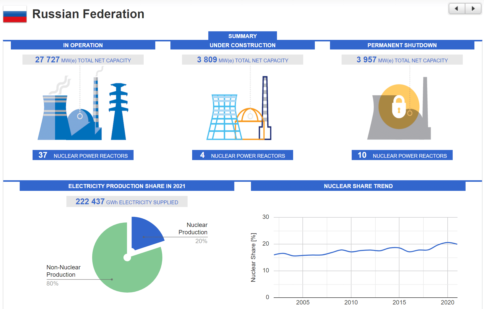- Россия. Атомная энергетика не доминирует, но ее доля плавно растет. Если в начале нулевых доля АЭС в общей генерации составляла порядка 15-16%, то к началу 20-х годов этот показатель вырос до 20+%. С начала 20-х годов Россия переходит на безотходный ядерный цикл, Росатом возводит объекты в том числе и за рубежом.
