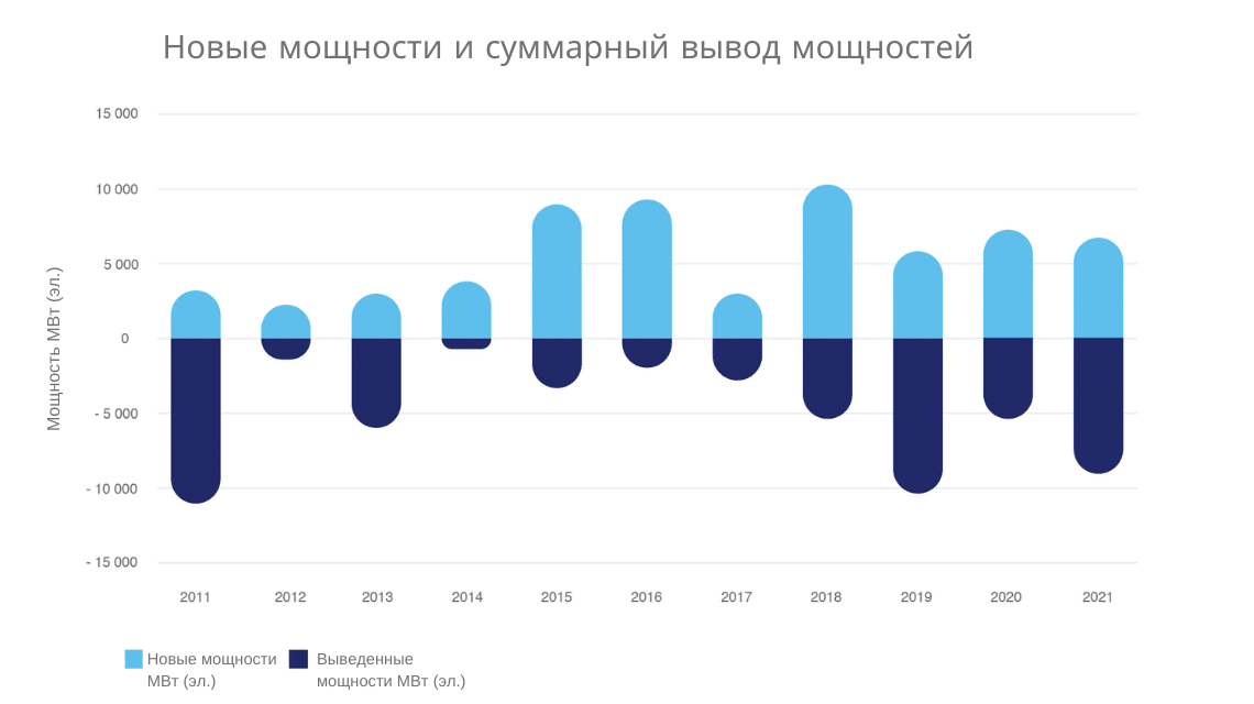 Реакторы не вечны, часть из них регулярно выводится из генерации. Это происходит из-за исчерпания проектного срока службы (не всегда его продлевают), не исключены и другие причины. В конце 10-х и начале 20-х годов наблюдается некоторое превышение выводимых мощностей, но это не меняет картину радикально. На дистанции в последние 10-20 лет генерация стабильно растет, вводятся в строй новые реакторы, растут и объемы производства электроэнергии.