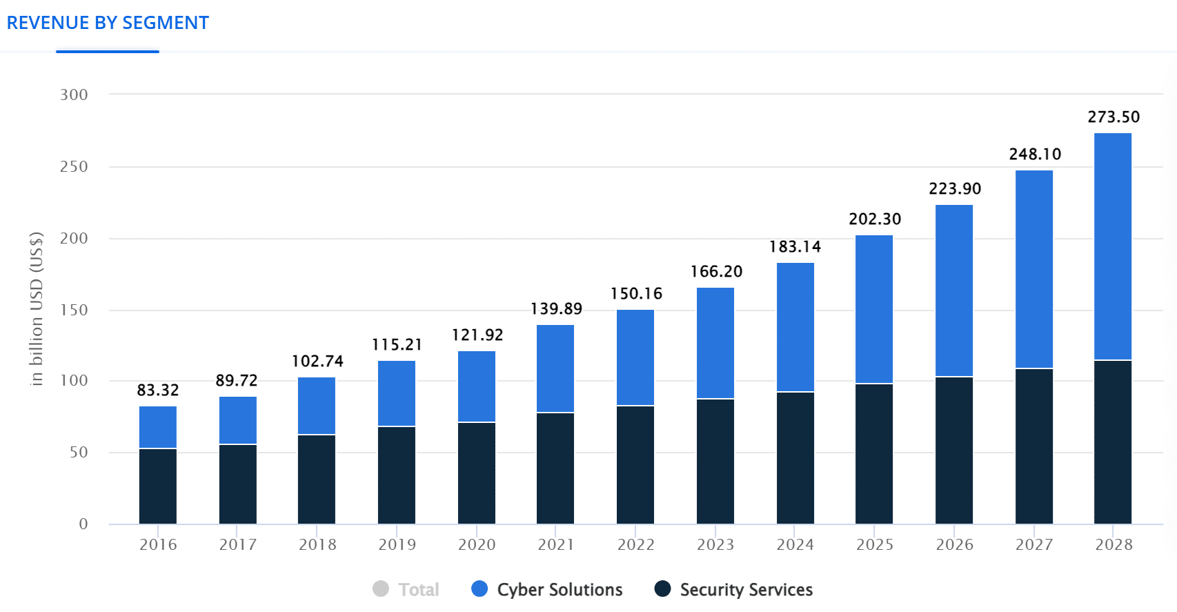 - Наибольший рост выручки придется на решения под нужны конкретного бизнеса. Кибербезопасность можно условно разделить на 2 направления – универсальные решения, например, защищающие от фишинга, заражения ПК вредоносным ПО и разработка с учетом пожеланий конкретной компании. К 2028 г. выручка должна достигнуть $273 млрд, в 2023 г. этот показатель составлял примерно $166 млрд.