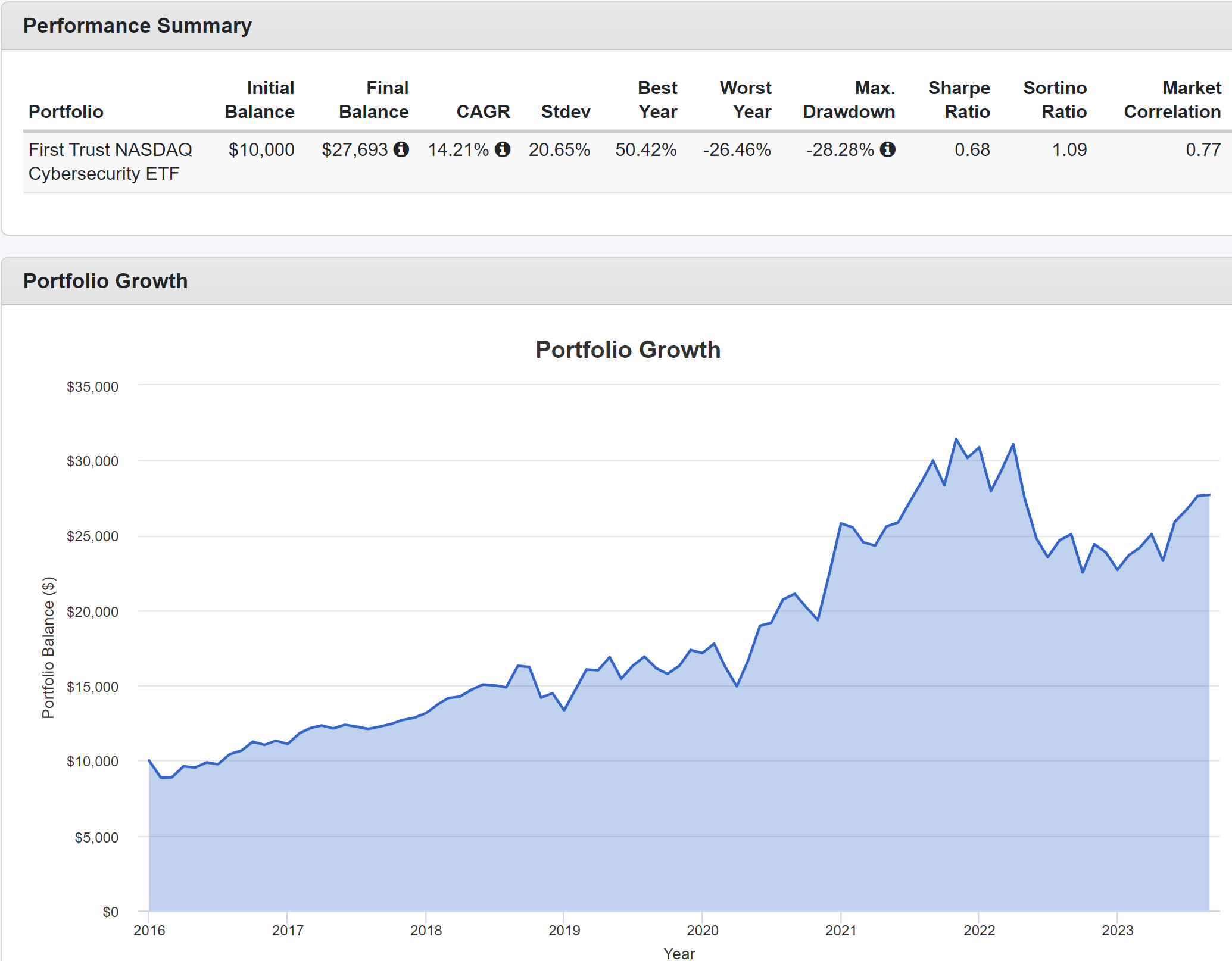 Сравнивать доходность с S&P 500 нет смысла. Фонды, посвященные кибербезопасности, появились сравнительно недавно и пока что еще нет нужной глубины истории.