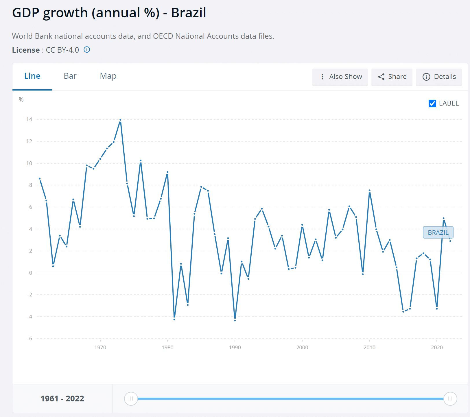 Уверенный рост сменился рецессией, это стало следствием нерешенных структурных проблем и падением стоимости сырьевых товаров. Из-за этого в период с 2014 г. по 2019 г. в среднем ВВП Бразилии падал на 0,3% в год. Пандемия обрушила бразильский ВВП сразу на 3,3%, правда, экономика быстро восстановилась – в 2021 г. рост составил 5,0%, а в 2022 г. – 2,9%. В целом, темпы роста остаются невысокими, по этому показателю есть существенное отставание от Китая.
