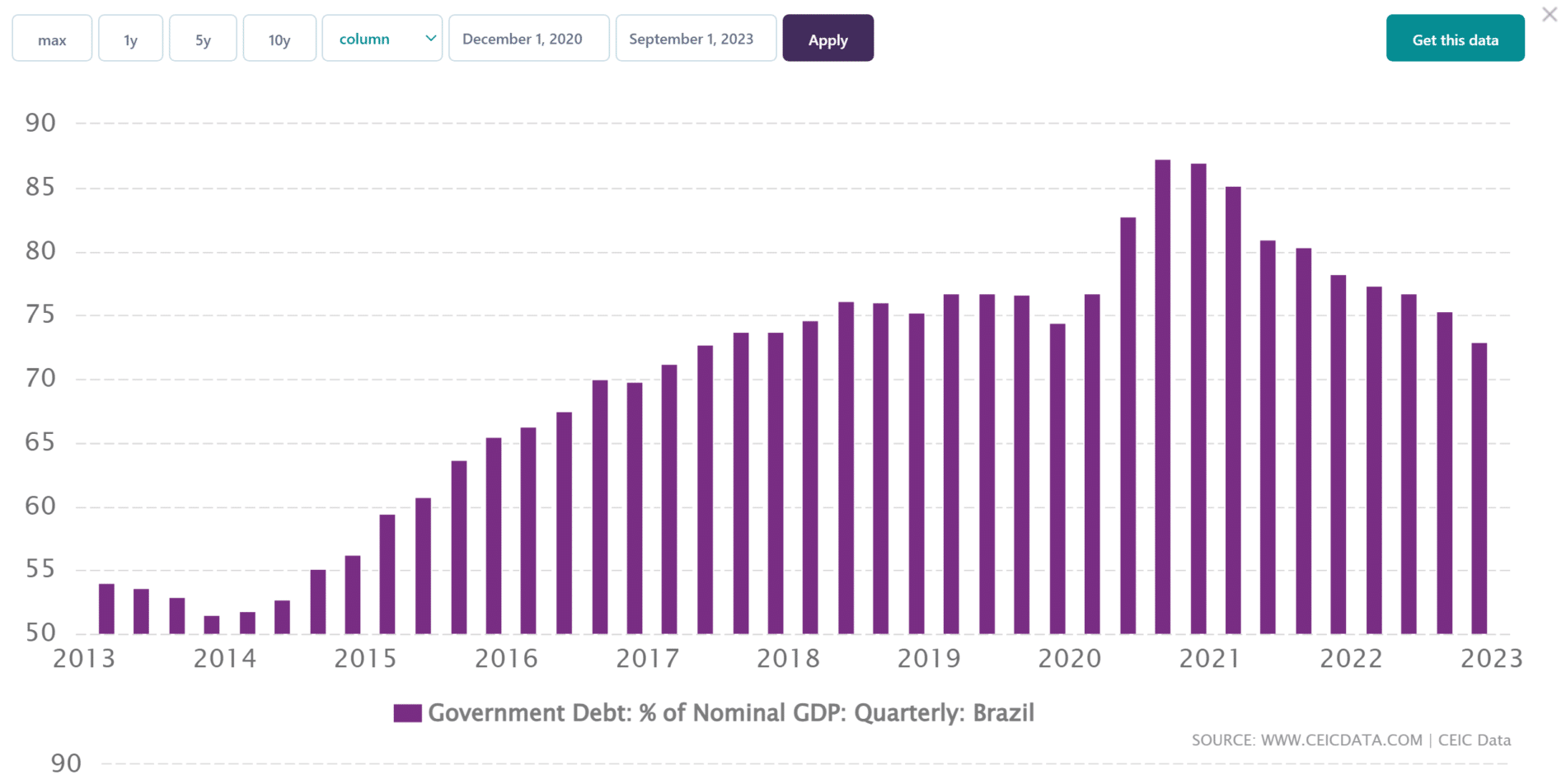 - Резкий рост госдолга. Этот фактор под контролем, но начало 20-х годов показало, что в экстренных условиях он может вырасти вплоть до 100+% ВВП. Это может ограничить развитие экономики Бразилии.