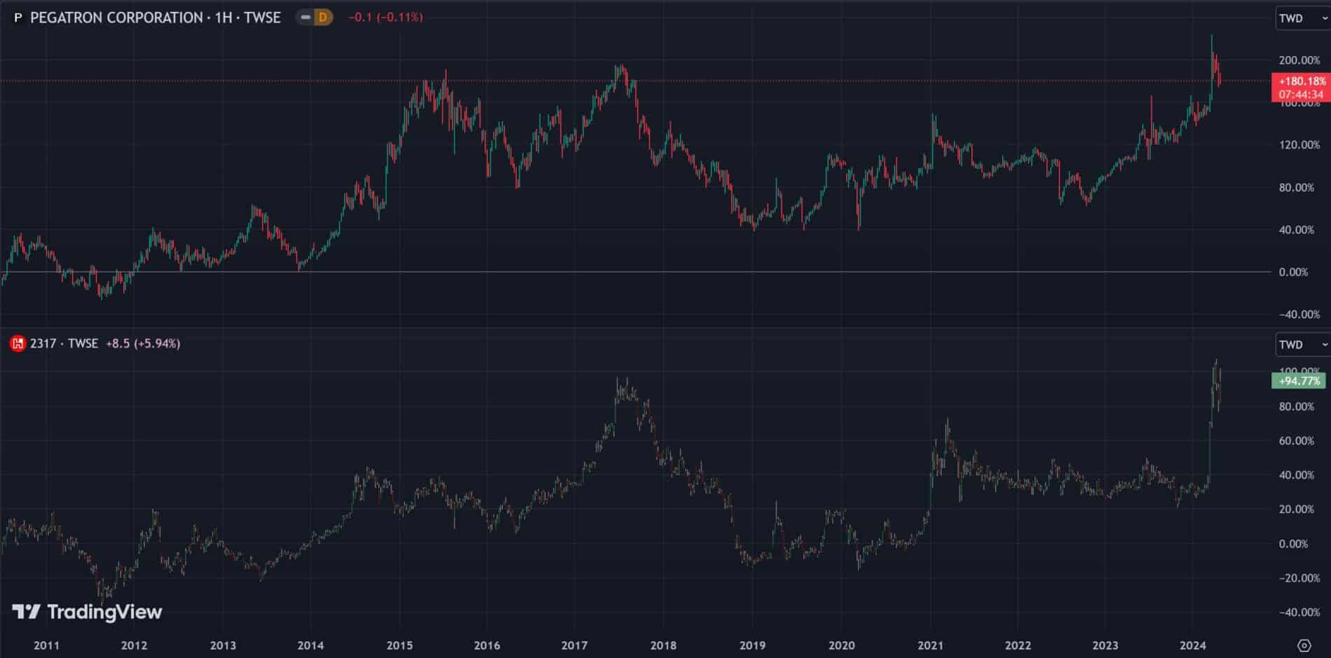 - Pegatron. Как и Hon Hai Precision Industry специализируется на проектировании и производстве электроники – от компьютеров и комплектующих до смартфонов. Бизнес обеих компаний схож, между графиками прослеживается прямая корреляция.