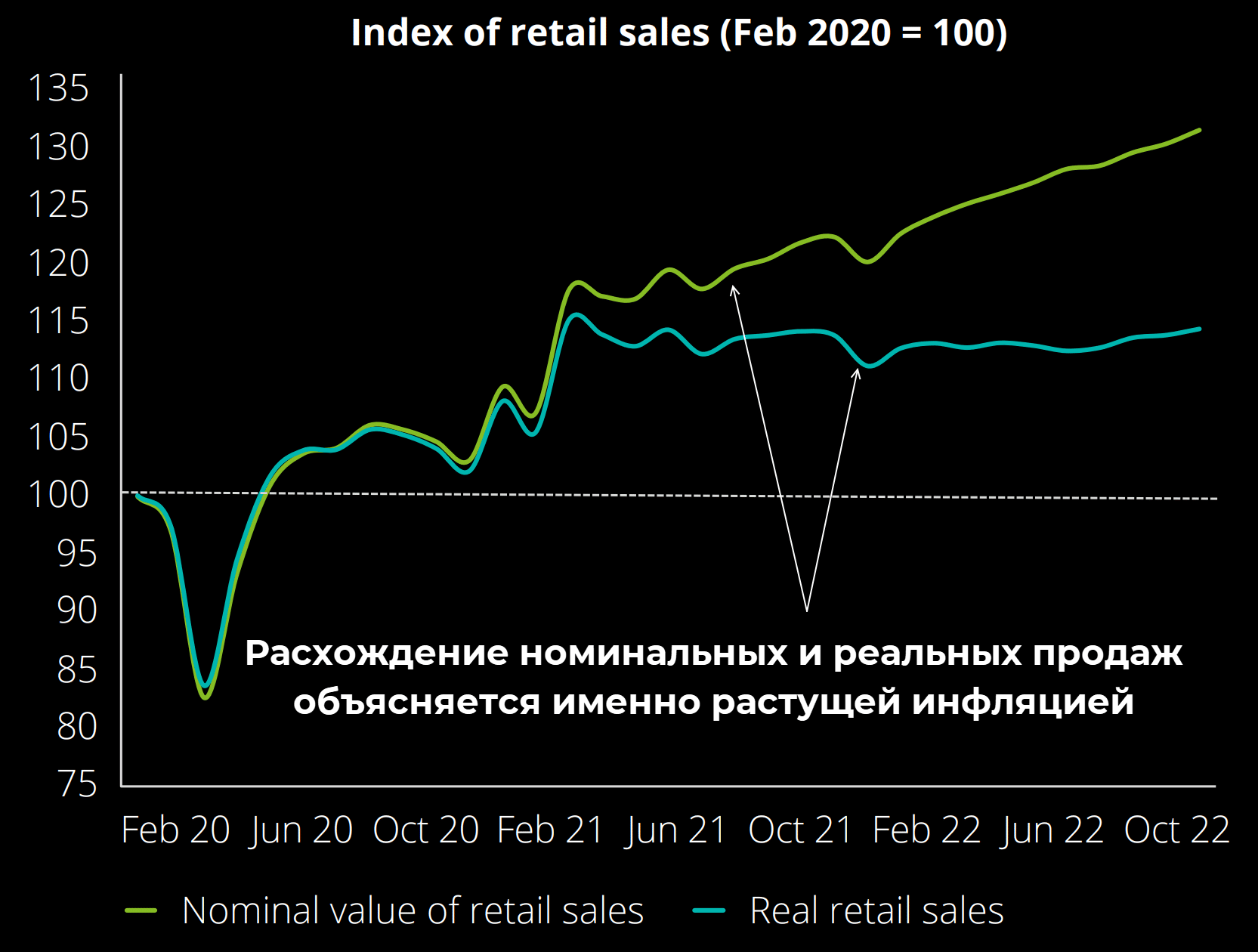 - Инфляция несколько искажает реальную картину происходящего. Рост номинальных заработных плат создает иллюзию того, что и рост продаж должен ускориться. У людей становится больше денег, часть этого излишка начинают тратить в магазинах. Но растущая инфляция мешает этому, реальные зарплаты в лучшем случае остаются прежними, зачастую снижаются. Номинальный средний недельный доход с декабря 2020 г. вырос на 8,3%. Но если учесть инфляцию, то на той же дистанции реальные доходы населения снизились на 5%. Тот же эффект наблюдается и в случае с продажами. На дистанции с февраля 2021 г. они выросли на 11,7%, но реальный показатель снизился на 0,7%.