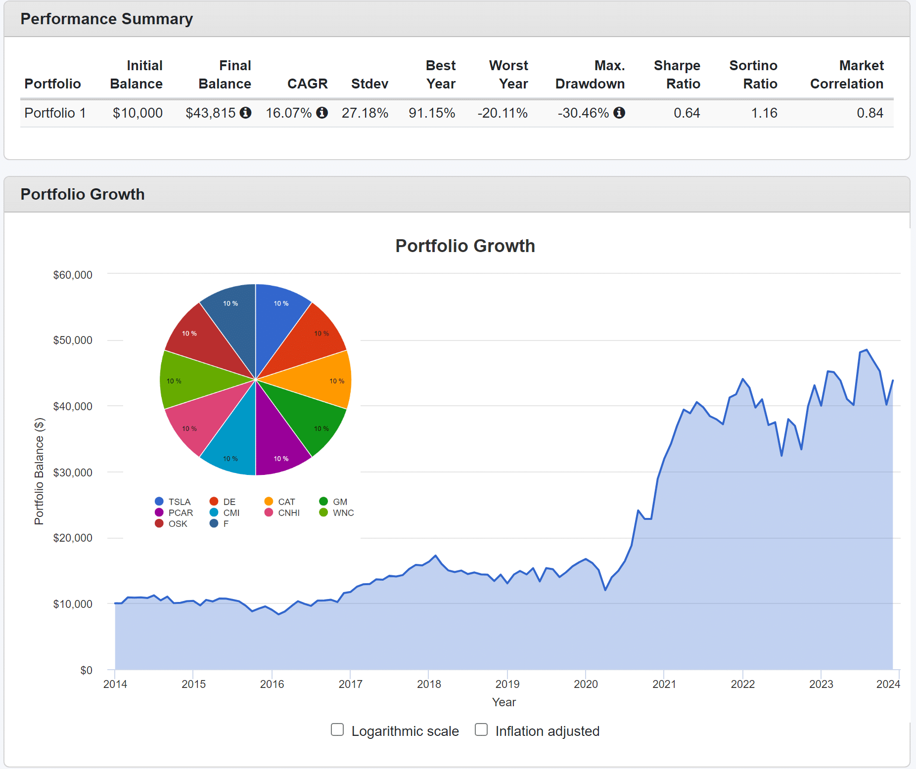 На дистанции за последние 10 лет портфель из перечисленных акций обеспечил годовой рост в среднем на 16,07%. При этом видно, что волатильность доходности великовата, а большая часть прибыль обеспечена в рамках постковидного восстановления. Начали восстанавливаться логистические цепочки, это повысило спрос в том числе на транспорт, то же касается производства и спецтехники.