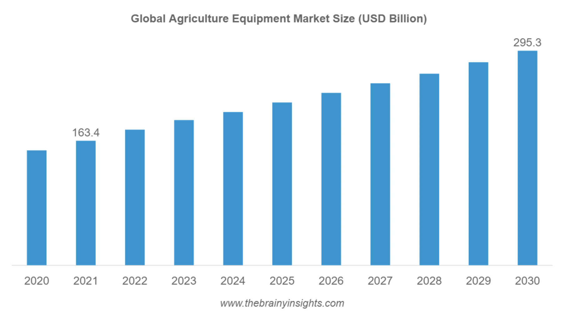 Если в 2021 г. объем рынка с/х техники составлял порядка $163,4 млрд, то к 2030 г. ожидается его рост до $295,3 млрд. Ожидается средний годовой рост на 6,8%. При этом в отдельных сегментах может наблюдаться большое отличие по темпам роста, самым перспективным направлением считаются тракторы, комбайны.