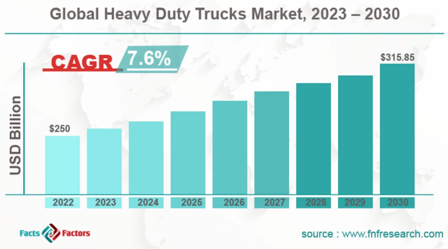 Примерно та же тенденция прослеживается на рынке тяжелых грузовиков. Facts & Factors оценивает его в $250 млрд в 2022 г., с перспективой роста до $315 млрд к 2030 г. Это означает рост в среднем на 7,6% за год, динамика сопоставима с легковыми автомобилями. Ожидается рост доли грузового транспорта, работающего на водороде, электричестве.