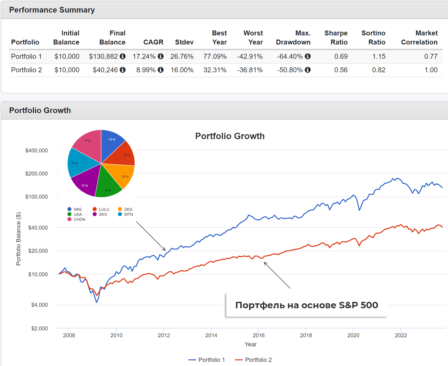 - Итоговая стоимость портфеля (оба портфеля стартовали с $10000) – $130882 и $40,264.